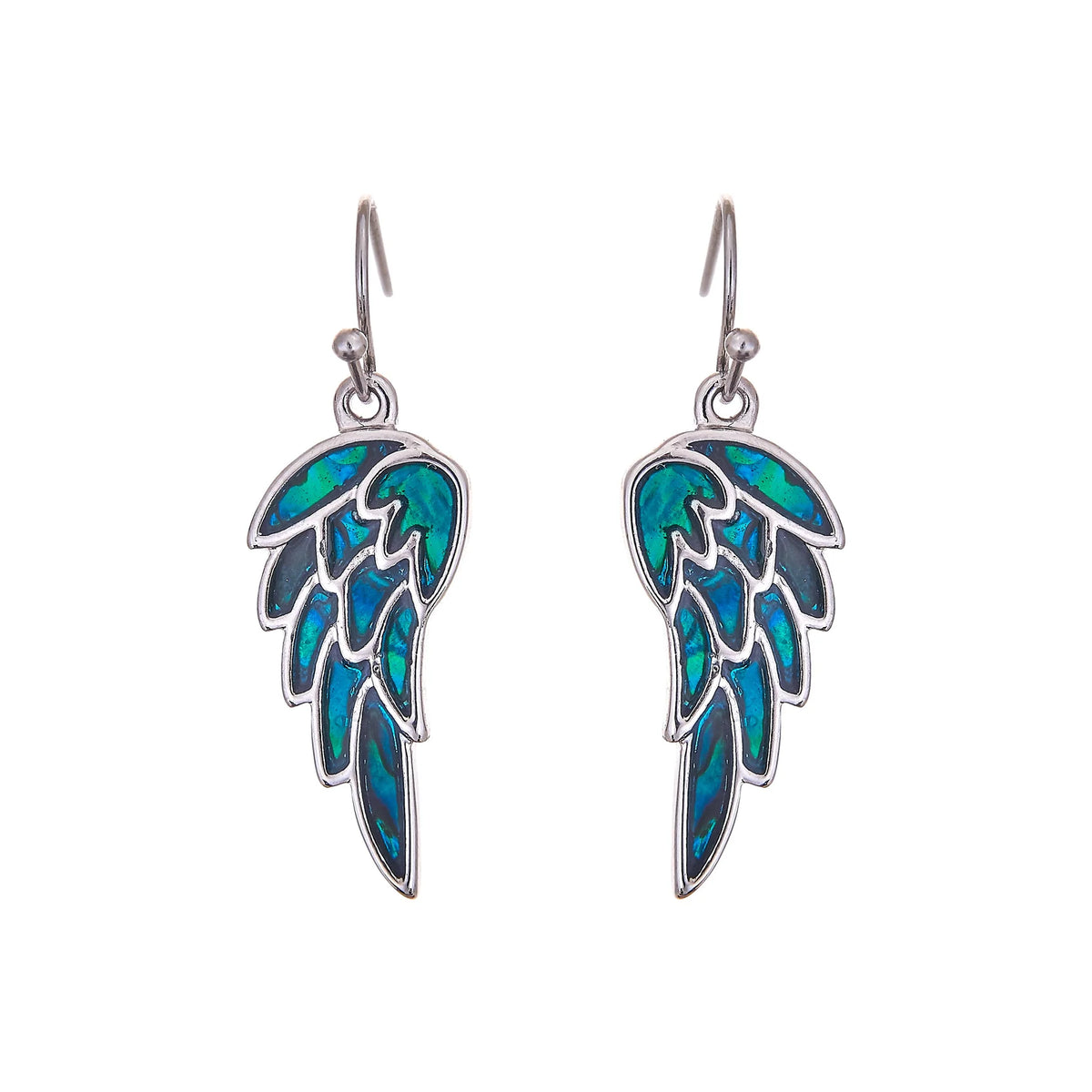 The Paua Shell Angel Wings Necklace features beautiful and natural Paua Shell shaped into angelic wings. Hypoallergenic and rhodium plated, it is free of nickel, lead, and cadmium. With a greeny blue color and a size of 35mm, it comes with an 18" chain. Complete your look with the matching earrings.